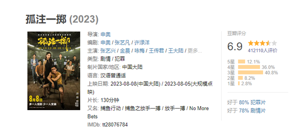 截稿前,《孤注一掷》豆瓣评分跌破7,目前为6.9分,超41万人评分,其中40.8%的观众给出3分。