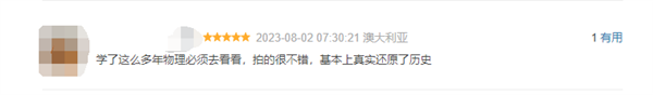 有网友评价该片称超出预期地好。诺兰电影终于有了比较复杂立体的人物 包括杜鲁门的多面都给到了。但是诺兰真是一个不太节制的人,一有好的视听点子,就反复炫。造成一定的疲劳。”学了这么多年物理必须去看看,拍的很不错,基本上真实还原了历史”。