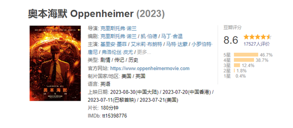内地8月30日上映!诺兰新片《奥本海默》豆瓣开分8.6:口碑两极分化