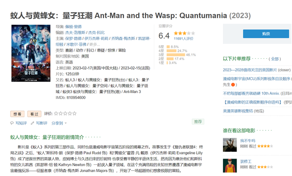 今晚《蚁人3》在国内影评网站豆瓣上开分了,只有6.4分,比之前的《黑豹2》的开分6.3高一些,但这也算不上高分,口碑显然没有稳住。