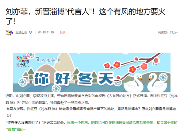 事实上,当时《去有风的地方》热播时,就兴起了一股去云南、去大理的文旅热潮。而今年1月份,官微文旅山东就发文写道刘亦菲,新晋淄博代言人!这个有风的地方要火了!”