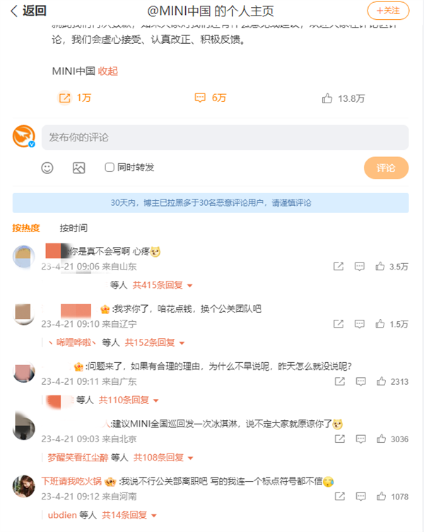 对于今天(4月21日)上午MINI中国最新的道歉内容,极目新闻评论称,堪称公关上的史诗级灾难。