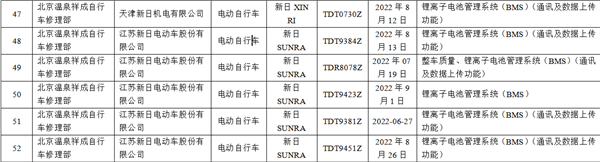 其中1批次规格型号TDT9384Z,生产日期/批号为2022年8月13日,1批次规格型号TDR8078Z,生产日期/批号为2022年7月19日,1批次规格型号TDT9381Z ,生产日期/批号为2022-06-27,1批次规格型号TDT9451Z,生产日期/批号为2022年8月26日,1批次规格型号TDT9452Z,生产日期/批号为2022年7月4日;1批次电动自行车锂离子电池管理系统(BMS)不合格,由北京温泉祥成自行车修理部销售,规格型号TDT9423Z ,生产日期/批号为2022年9月1日。