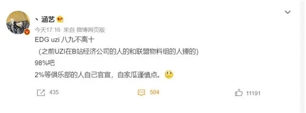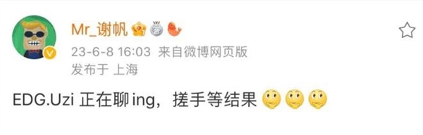 上单957、圣枪哥、涵艺、谢帆等人都纷纷确认确认Uzi加入EDG,这个消息让大家非常激动,期待正式官宣。