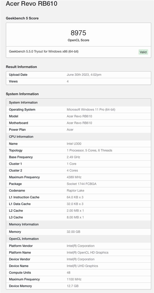 GeekBench 5数据库里出现了一款宏碁的设备Revo RB610”,处理器就是这款Intel U300,但不知道是什么样的设备。