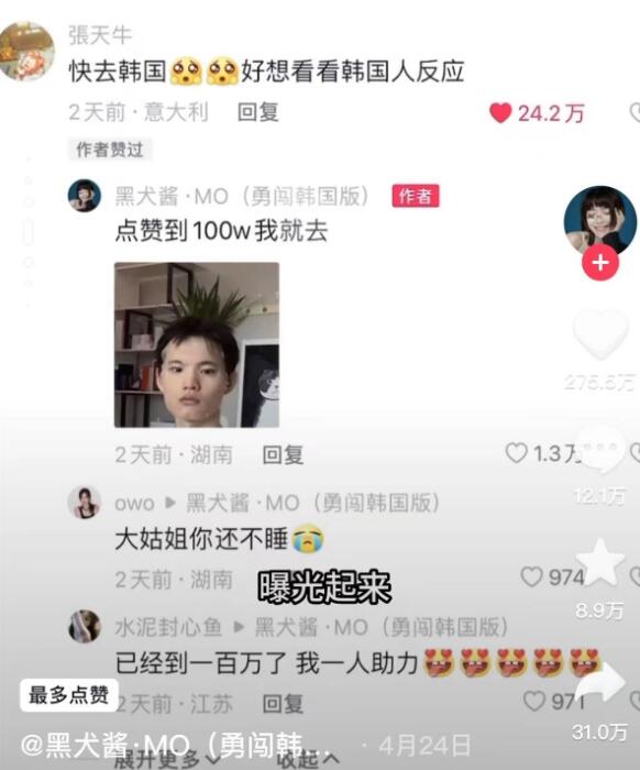 当时,“黑犬酱”回复说,“如果有100万个赞我就去。”她觉得机会非常渺茫,但之后点赞数量激增,她便兑现了承诺,预订机票去了韩国,目前她的那条仿妆视频获得了275.5万个赞。