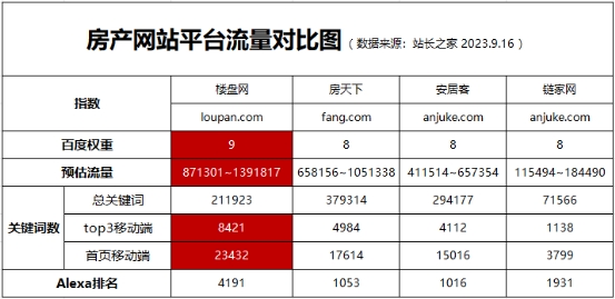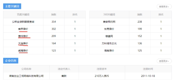 百度一直是国内网站的核心流量来源,网站推荐榜单权重最 大因子的是百度权重,该权重由网站的关键词数量、每一个关键词的排名情况以及百度指数综合计算而来。随着移动互联网的迅猛发展,移动端关键词的数量和排名情况至关重要。楼盘网近年来根据政策市场热点和全国合作百城做了大量最 新准确的高质量内容,今年还上线了房产百科视频,楼盘测评视频,因此获取了更多的百度收录和关键词流量,尤其是移动端频频霸屏百度搜索精选,排名前三位与首页移动端关键词数量超越多家等老对手。城市+房价,城市+房产,例如南京房价、惠州房价、东莞房价等房产类准确热点关键词均排名首位。