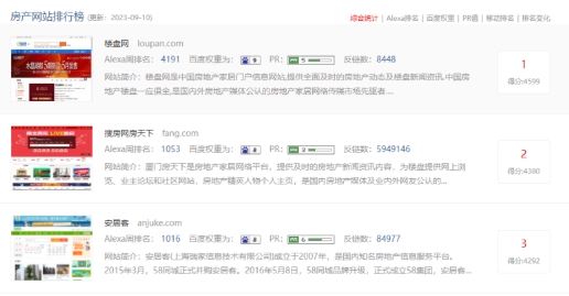 据了解,房产网站排名榜单是根据百度权重和网站PR值三方面情况对网站进行综合打分评估的排序结果,楼盘网以 4599 的得分在所有房产网站中排名居首。并且楼盘网是所有房产网站中一个百度权重为 9 的网站。