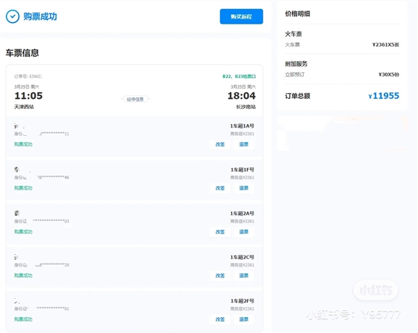 从其晒出的购票截图来看,这辆高铁从天津开往长沙,共买下商务车厢5个座位,每个座位2361元,共计话费11955元。