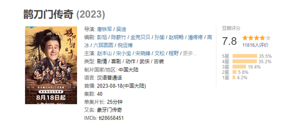 目前,《鹊刀门传奇》已在豆瓣开分,超1.1万人评价,豆瓣评分为7.8,有35.5%和35.2%的观众分别打出5星、4星的评价,口碑还算可以的,毕竟是有赵本山的出演。
