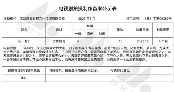 公示显示,电视剧《花千骨2》备案,由江西慈文影视文化传媒有限公司出品,预计2023年12月开机,共40集,制作周期4个月。