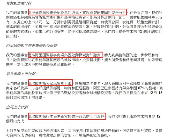 徐宏:从3月开始做整体重组到今天,我们都在进行规划,包括细致计划的考虑。在这个阶段,你可能也能看到很多例子的存在,阿里云的分拆确实会有各种实际的特殊情况,需要我们考量,可以跟大家讲的是,我们会细致考量整体的方案,照顾到更多投资人的考虑,包括在税务等方面,最终我们希望给到股东一个回报, 今天无法透露更多细节。关于到底是用回购还是派息的形式,我们谈到了云业务剥离采用的派息形式,至于哪种形式更好,我觉得可能在市场里有不同的声音,但是我们的CMC会很好地去整体评估和平衡,也包括其他可能可以给股东回报的方式。关于盒马的IPO计划,我们宣布的是希望在未来的6~12个月可以完成,在这个过程之中,包括融资方案,包括当中的细节,目前还是在计划当中,所以今天我可能也没办法向你介绍太多细节。