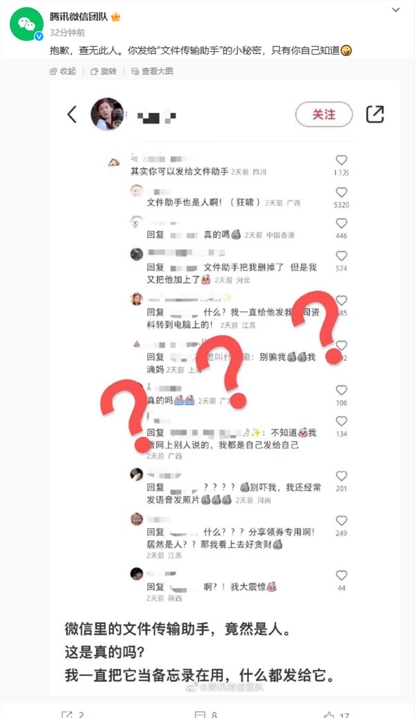 对此,腾讯微信团队官微已经火速回复称:抱歉,查无此人。你发给文件传输助手”的小秘密,只有你自己知道。”