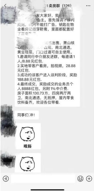 这些房主会创建二手房经纪人群并提供诱人的金钱奖励,在中介帮他们成功出售房子的情况下,会提供高达8888元红包和1%佣金的奖励。