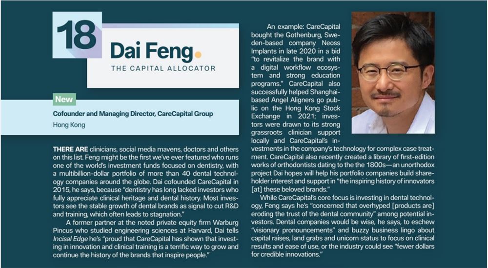 其中,因创建了一个“对全球口腔医疗有显著贡献的投资基金”,松柏投资集团合伙人冯岱先生入选“全球口腔行业最 具影响力的 32 个人物”之一,位列榜单第 18 位。