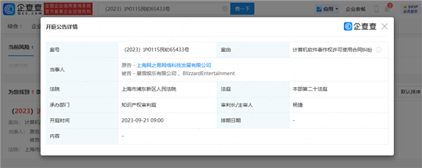 企查查APP显示,近日,上海网之易网络科技发展有限公司与暴雪娱乐有限公司新增一则开庭公告。
