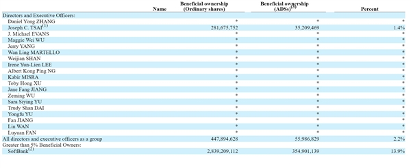 文件显示,软银持股为13.9%,仍为公司最大股东。截至2022年7月15日,软银持股为23.9%。对比来看,过去一年,软银对阿里的持股下降了10%。