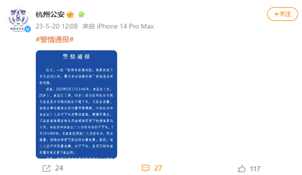 5月20日消息,杭州公安通报了近日发生的一起乘客赖网约车上24小时”的事件,全文如下: