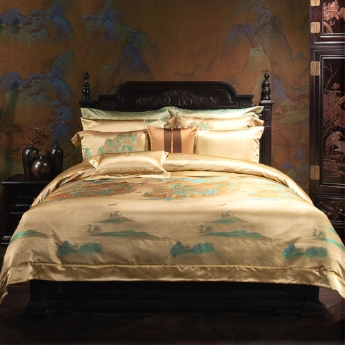 梦洁采用了高质量的真丝,来勾勒出画卷上的景象,通过谷金色与青绿色的搭配,将中国古老的人文气息注入其中,为床品注入了全新的艺术内涵。
