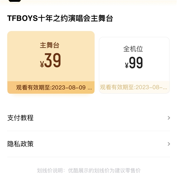 优酷App显示,TFBOYS十年之约”演唱会提供两种门票套餐、一个升级套餐,其中演唱会主舞台票价39元,全机位价格99元。