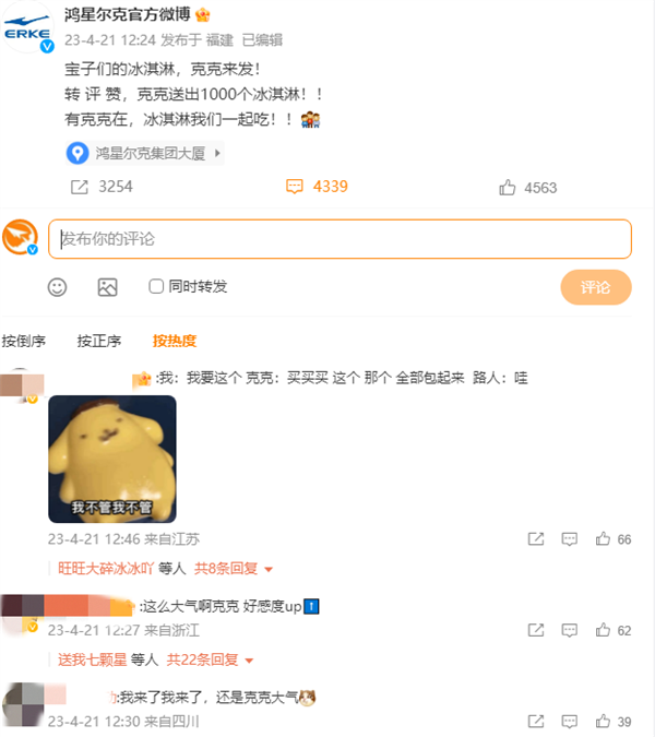 没想到的是,今天中午,鸿星尔克官微也深谙这波流量密码”,开启了转评赞送1000个冰淇淋的活动。