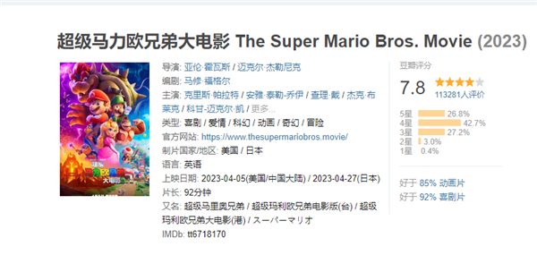 据了解,《超级马力欧兄弟大电影》于今年4月在中国内地上映,截稿前,该片在豆瓣的评分为7.8分,超11万人打分,其中5星占26.8%,4星占42.7%。