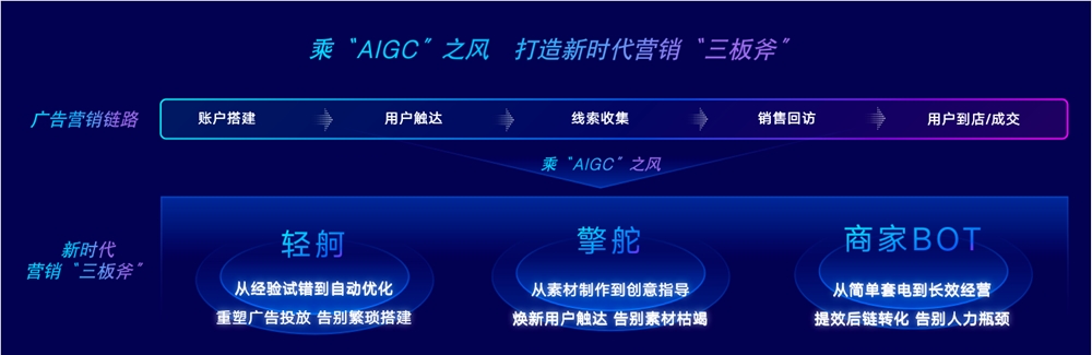 百度推出的首 个AIGC教育行业营销解决方案中,三板斧“轻舸”、“擎舵”、“商家bot”的巧妙结合,切实有效为教育行业广告营销降本增效。三大产品基于生成式AI能力,全面覆盖教育行业营销全链路。“轻舸”以自然语言交互,重构营销表达,告别复杂创编;“擎舵”聚焦用户触达环节,只需要简单的创意指导输入,就可以批量制作出精美的创意素材,焕新用户触达,告别素材枯竭;而“商家bot”则覆盖从线索获取到到店的后链路,帮助商家更有效的在百度经营,告别人力上的瓶颈。