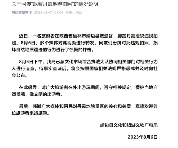 今日凌晨,靖边文旅宣传”微信公众号发布情况说明,靖边县文化和旅游文物广电局表示,已派文化市场综合执法大队协同相关部门对相关行为人进行追查,待事实查证后,将会按照国家相关法规严格惩戒并及时向社会公布。