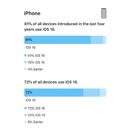 同时,72%的所有iPhone运行iOS16,20%运行iOS15。约8%的iPhone运行较早的版本。