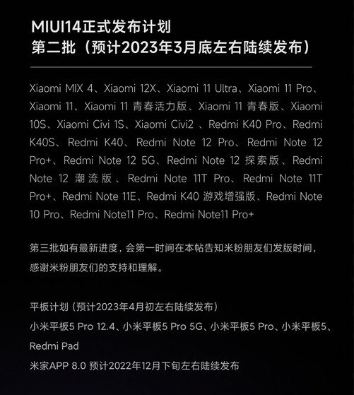 小米公布了MIUI14正式发布计划的第二批,预计2023年3月底左右陆续发布。