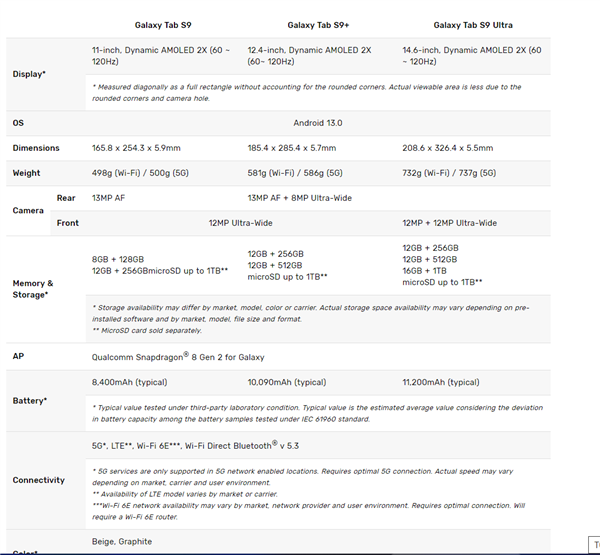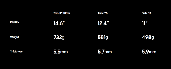 这三款平板分别是GalaxyTabS9、GalaxyTabS9 及GalaxyTabS9 Ultra,硬件配置差不多,主要是屏幕、重量、尺寸及电池的不同。