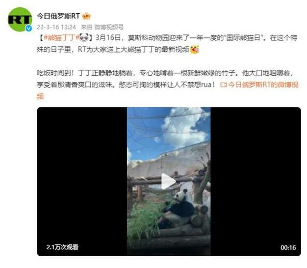 今日俄罗斯微博报道,3月16日,莫斯科动物园举行了一年一次的“国际熊猫日”。吃午饭的时候,大熊猫“丁丁”专注地咬竹子。