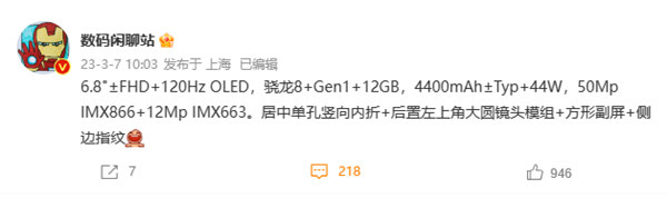 此外,该机将采用圆形镜头模组,内置5000万像素索尼IMX866主摄,辅以1200万像素索尼IMX663镜头,另内置4400mAh电池,支持44W快充。