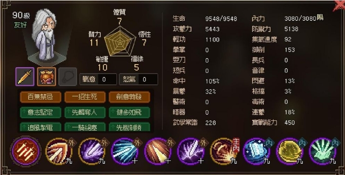 剑痴要注意的是,战意每到150以上就准备要吃万剑归宗了,不过剑痴很常战意200才会放大绝,如果剑痴没内功,则是只要战意满150就会放大绝,再精算一点可以在剑痴金色功法CD到的时候,靠防御来抵挡高伤害的技能,再以治疗或吃药方式,尽快拉回血量。
