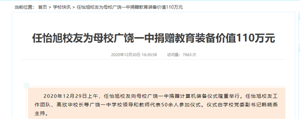 值得注意的是,从山东省广饶县第一中学官网获悉,2020年12月,旭旭宝宝”任怡旭向母校广饶一中捐助了283台计算机和20套触摸屏一体机,价值110多万元。