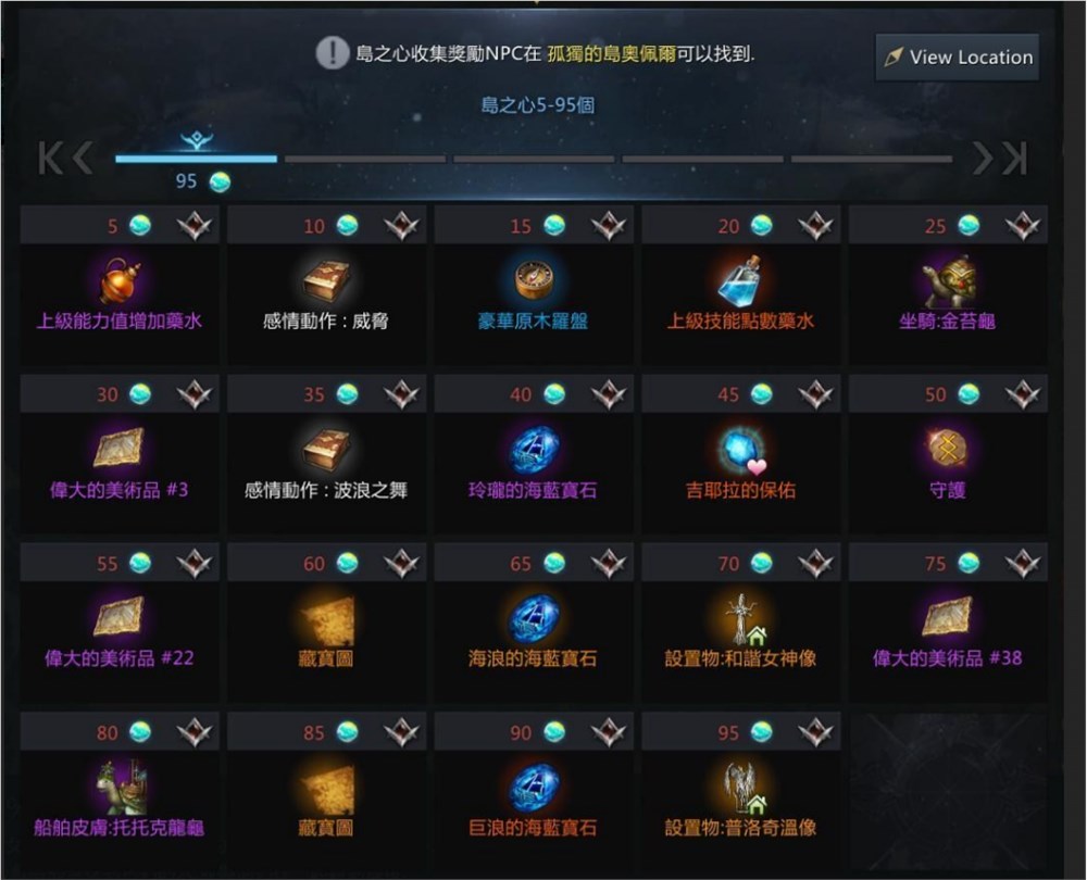 首先岛之心可以在NPC孤独的岛奥佩尔找到,有情感动作,有技能药水,还有坐骑等等。
