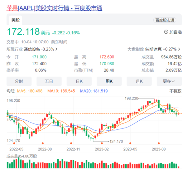 值得注意的是,苹果公司目前的股票也处于高点位置,从今年1月份开始,其股票开始一路走高,以129美元的价格,最高冲到7月份的195美元,而最近3个月,苹果股价又开始有下跌的趋势,此次抛售也属于高位减持。
