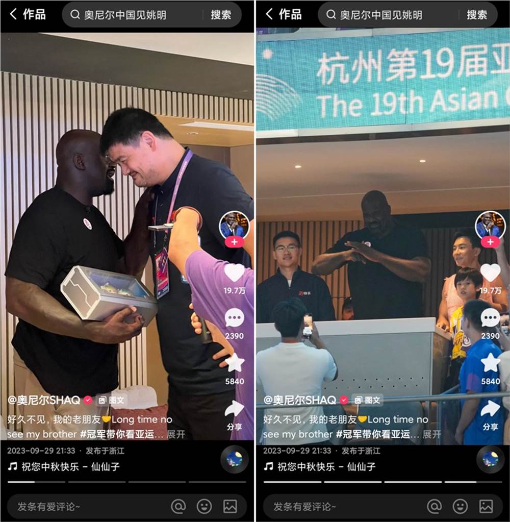 当晚的《冠 军观赛团》直播中,奥尼尔在亚运现场又一次见到“老朋友”姚明,两人一见面就拥抱问候,姚明还为奥尼尔送上杭州亚运会吉祥物“江南忆”玩偶。随后,“大鲨鱼”在其快手账号发布与姚明相聚的视频,并配文“好久不见,我的老朋友”,老铁们则激动地评论:“谁的DNA动了!”