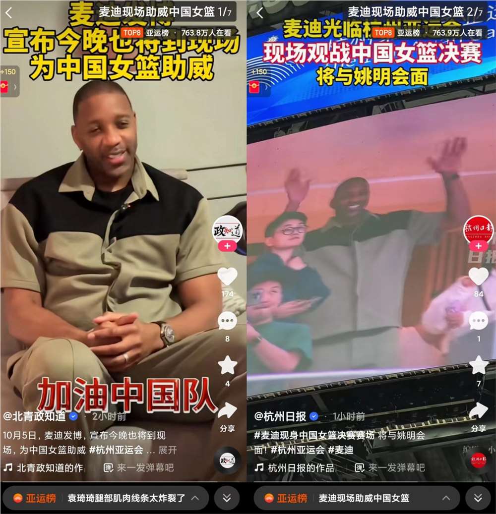 值得一提的是,在本届亚运会的篮球赛场上,麦迪不是唯 一一位亲临现场支持中国女篮的NBA球星。早在 9 月 29 日,由中国女篮对阵印度尼西亚女篮的比赛中,NBA传奇巨 星沙奎尔·奥尼尔作为快手《冠 军观赛团》的嘉宾,就和“全民健身教练”刘畊宏一起出现在观众席,引发现场观众一阵欢呼。
