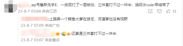 有网友表示:真的是有点可惜了,Uzi前中期来越了几次塔有一定的小优势,后面团战真的是有点操作不过对面了,下把好好调整吧,不然就真的要被带走了。”也有网友质疑Uzi称AP韦鲁斯先手E,一波团打了一层被动,三件套打不过一件半,换阿水、ruler早结束了”。
