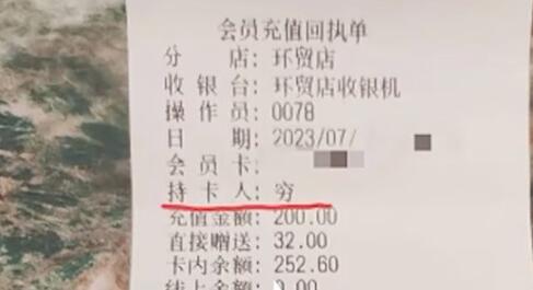 四川成都一位顾客在一家面包店办理会员卡并充值200元后,发现自己在小票上被备注为 “穷”,感觉自己受到侮辱。