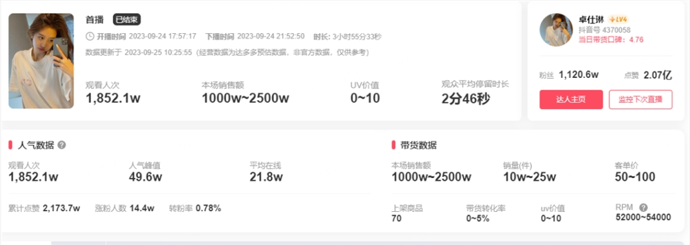 一番引流下来,卓仕琳直播的人气也是水涨船高。据统计,24日近3个小时的直播中,卓仕琳的直播间共有1852.1万人观看,最高时有49.6万人同时在线,带货的GMV也在1000万-2500万。作为对比,卓仕琳自己在直播时,最高人次只有3万多,这样的数据是她从未到达的高度。