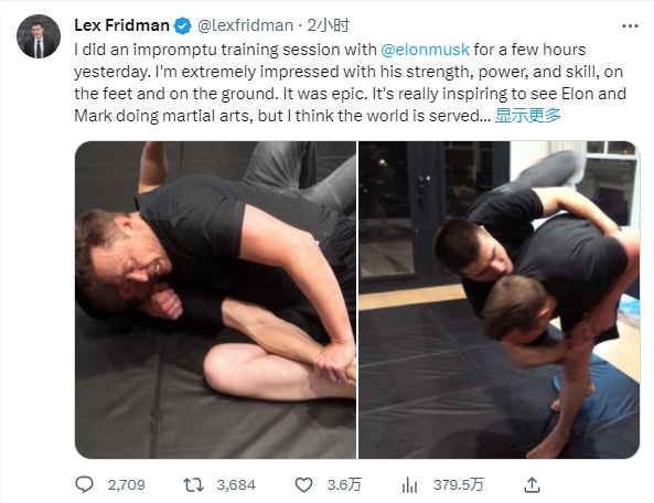 站长之家6月28日 消息:今天,播客主持人Lex Fridman发布了两张与马斯克练习格斗的照片。此前,Fridman还分享了与扎克伯格一起练习柔术的视频。