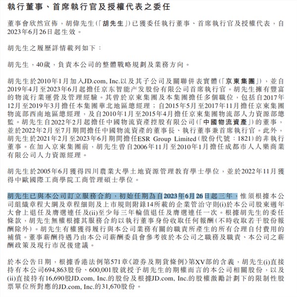 据介绍,胡伟于2005年6月获得四川农业大学土地资源管理教育学士学位,2022年11月获得中欧国际工商学院工商管理硕士学位,胡伟2010年1月加入京东,拥有丰富的物流行业运营及管理经验。