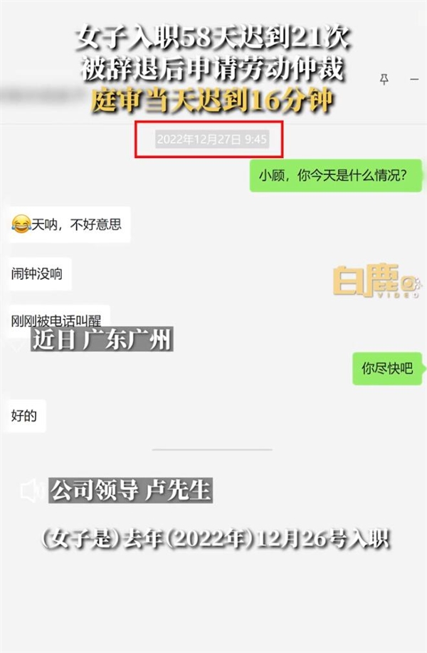 4月19日消息,据白鹿视频报道,广东广州一名女子因多次迟到被辞退,不满公司补偿申请劳动仲裁。