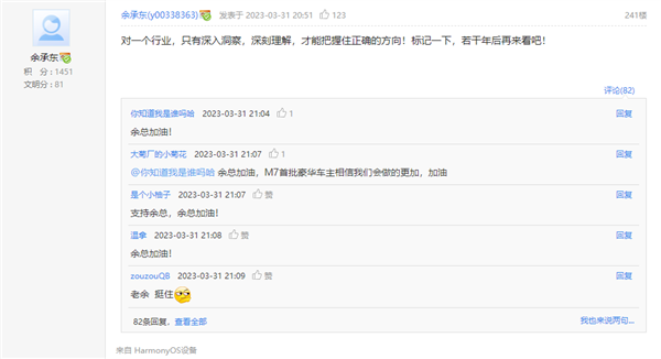 2023年3月31日晚,余承东在帖子下留言:这个时代变了,这只会让我们更加艰难!若干年后,大家都会看明白的!留给时间去检验吧!”