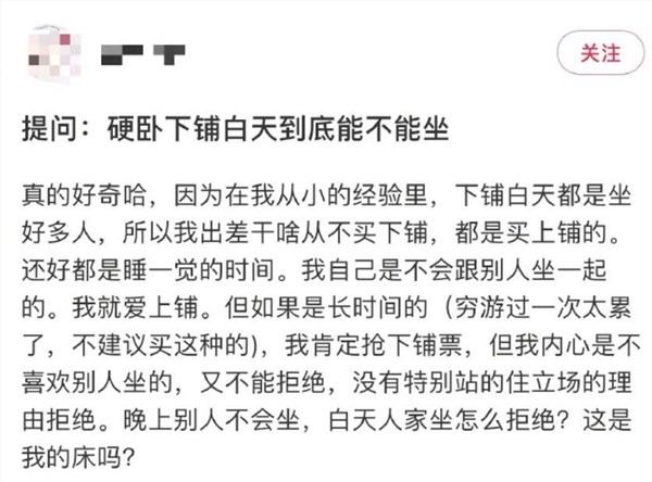有网友表示,硬卧下铺虽然很方便不用爬上爬下,但是到了晚上我们想要休息睡觉的时候,上铺和中铺的人有可能还坐在我们的下铺,聊天玩手机吃东西。
