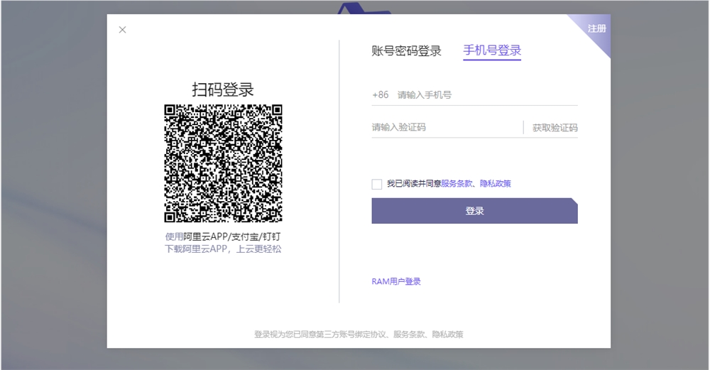 2、大家需要先登录自己的账号,如果没有账号的就需要先注册,当然了,你也可以使用阿里的一些APP进行登录,比如支付宝、阿里云的app、钉钉等,同时也是支持手机登录的。