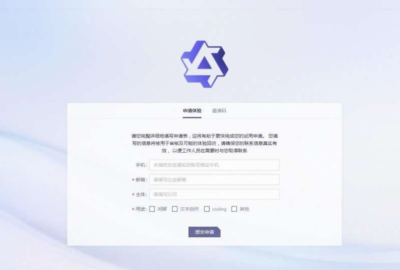 3、在登录成功之后,大家就可以进行申请体验了,可以获得邀请码,需要在申请的页面填写手机号、企业邮箱、公司名称以及选择用途,然后提交一下申请即可。