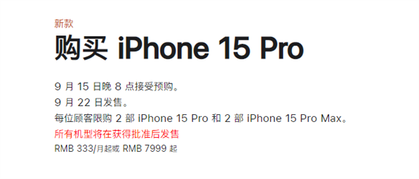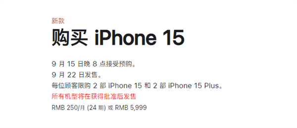 5999元起!iPhone 15系列周五预售:官网限购2台、有24期免息